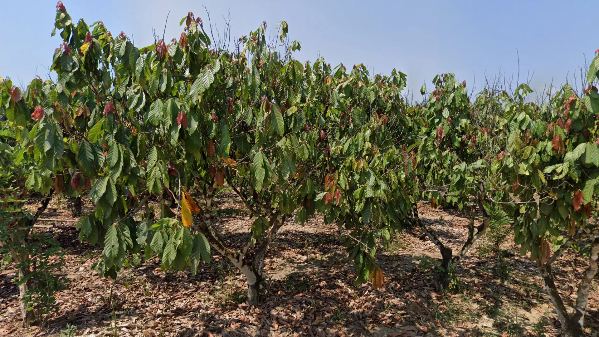 Cocoa (Theobroma cacao) can be recognised by its relatively large oval leaves and by there often being red or brown leaves visible on the tree. Sometimes the fruits in the form of cocoa pods can also be spotted. It is mainly seen in Sulawesi and western Sumatra.