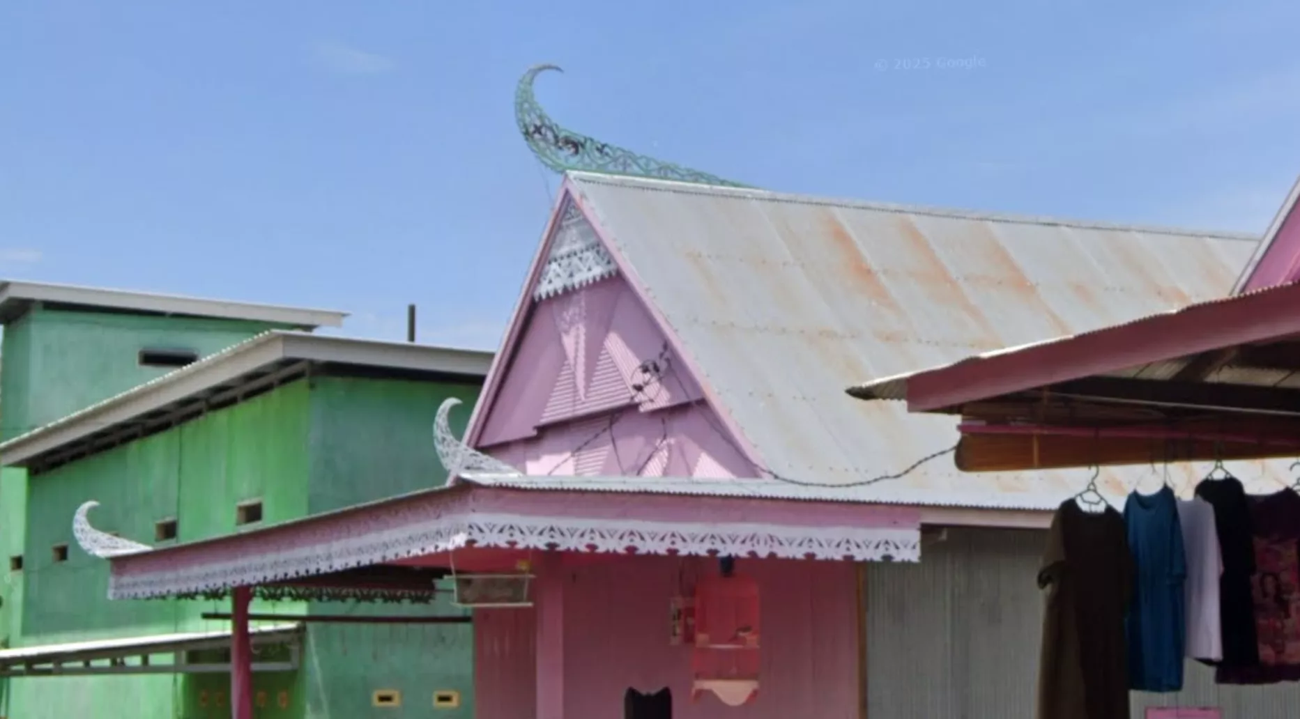 In the regions of Sumatra and Kalimantan that lie opposite Malaysia, many buildings have metal canopies with curved ends. These canopies are often blue or red.