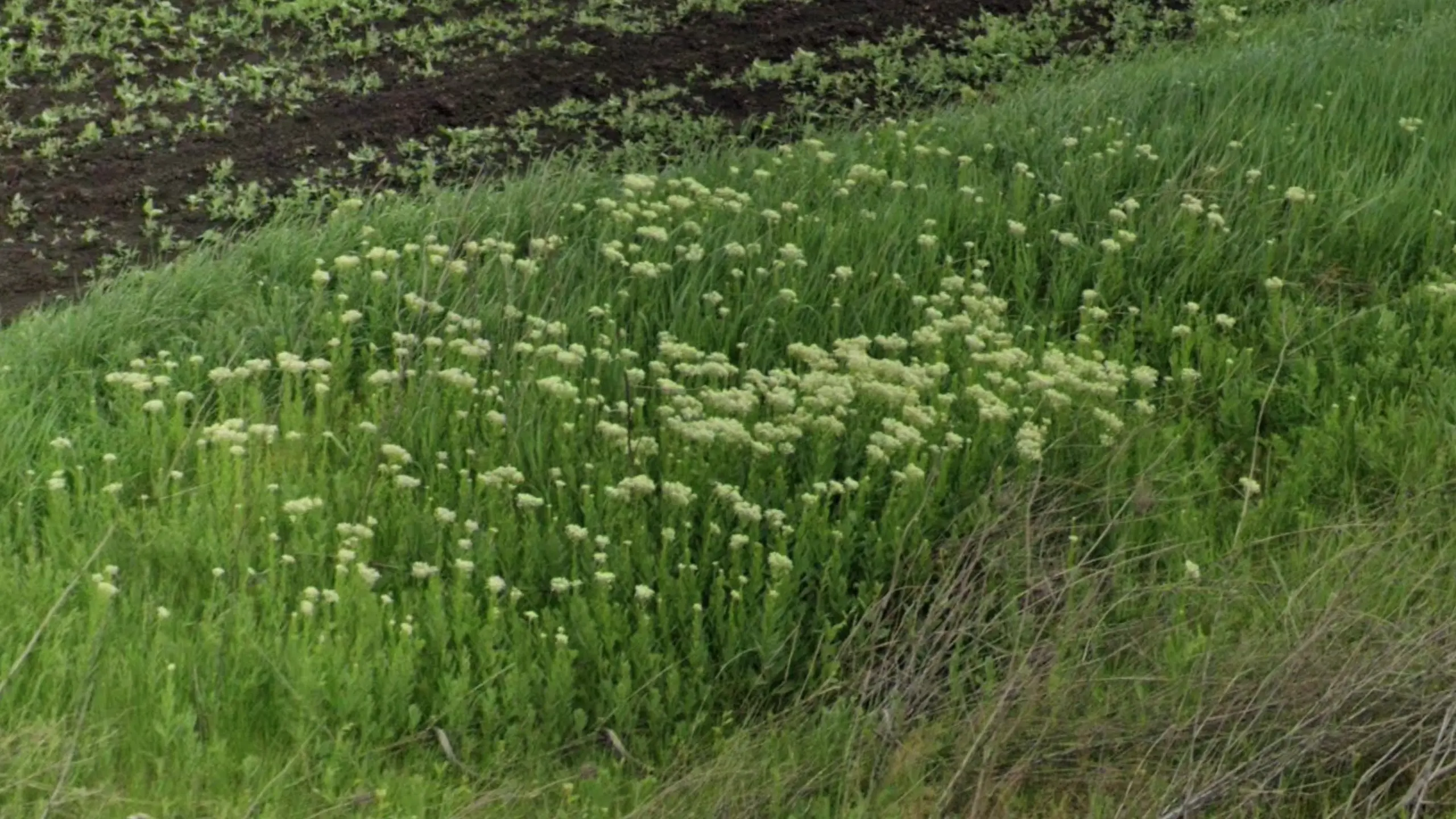 Hoary cress (Lepidium draba) can be identified by dense clusters of white blossoms and leaves that hug the flower stalk. They are found most often in three hot spots across the country, namely the counties of Teleorman, Constanța and Iași. Topography can be very useful to tell these three regions apart, generally speaking Teleorman is dead flat, Constanța has slight hills and wind farms will usually be visible, whereas Iași has larger hills and you can often see trees planted next to the road.