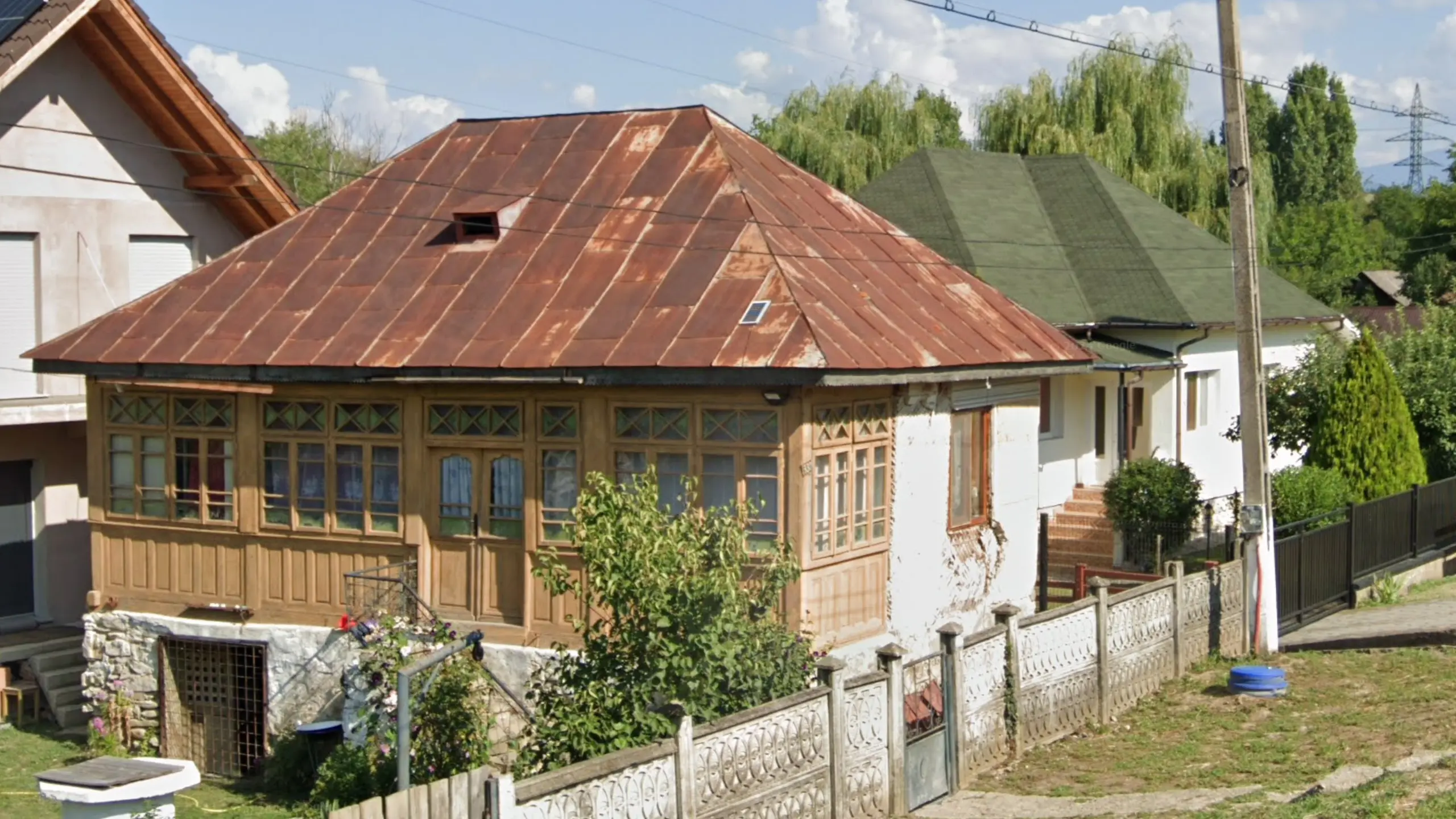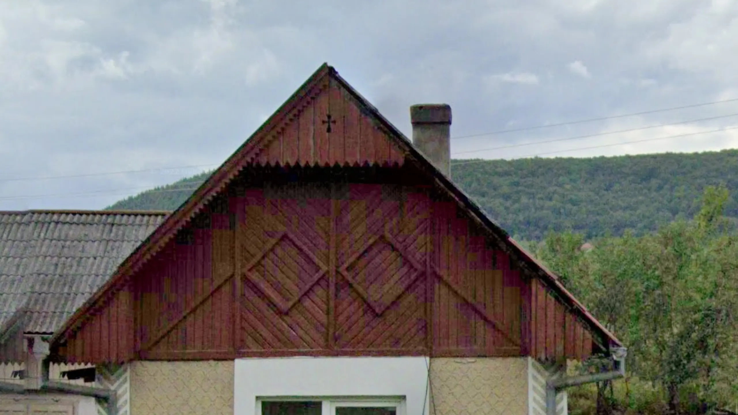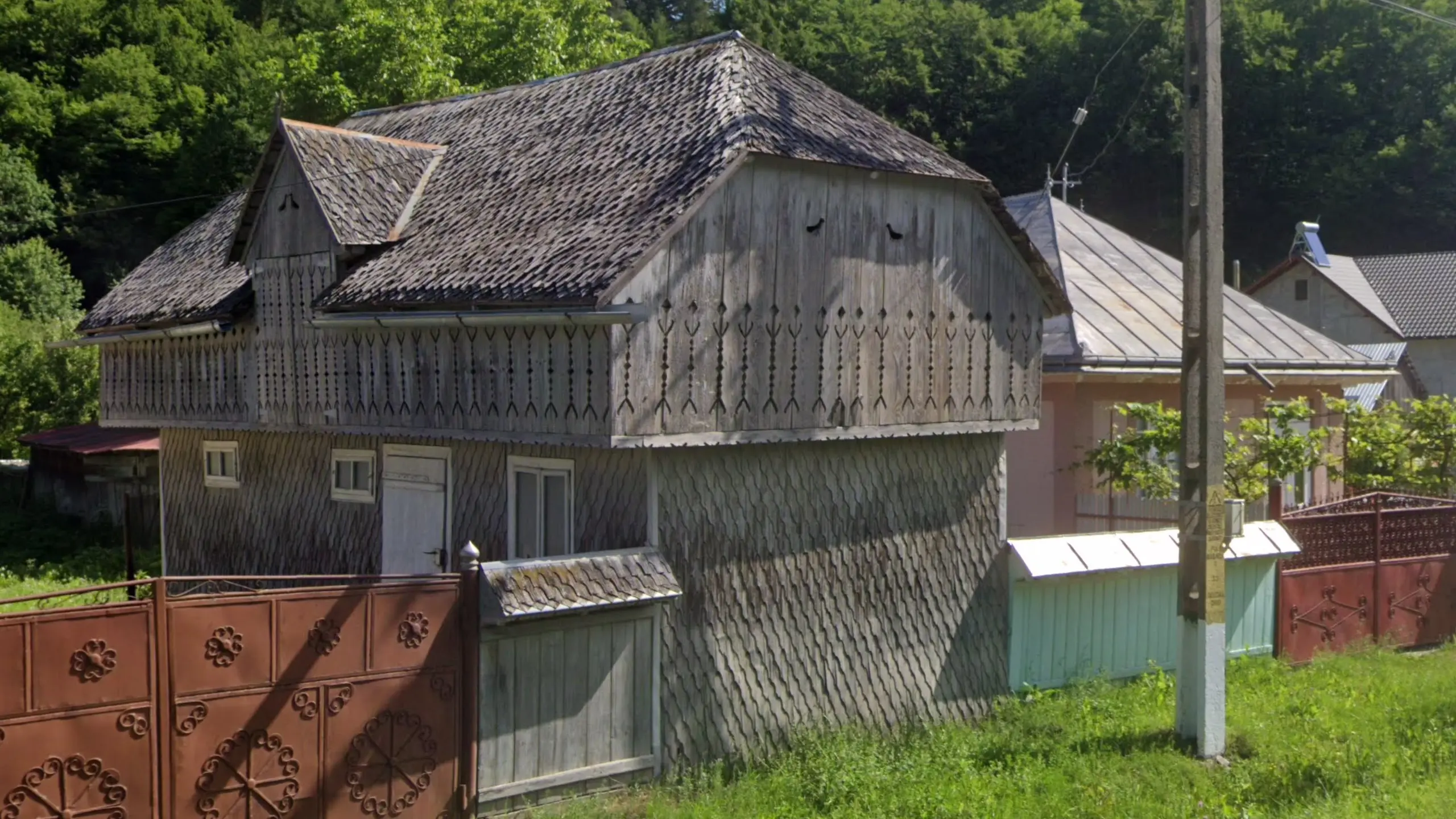 Suceava County has a lot of traditional houses with many unique features. One of these is vertical stripes that decorate either the gables or walls of houses. The ‘sun’ pattern on the gable in the image is also a Suceava meta.