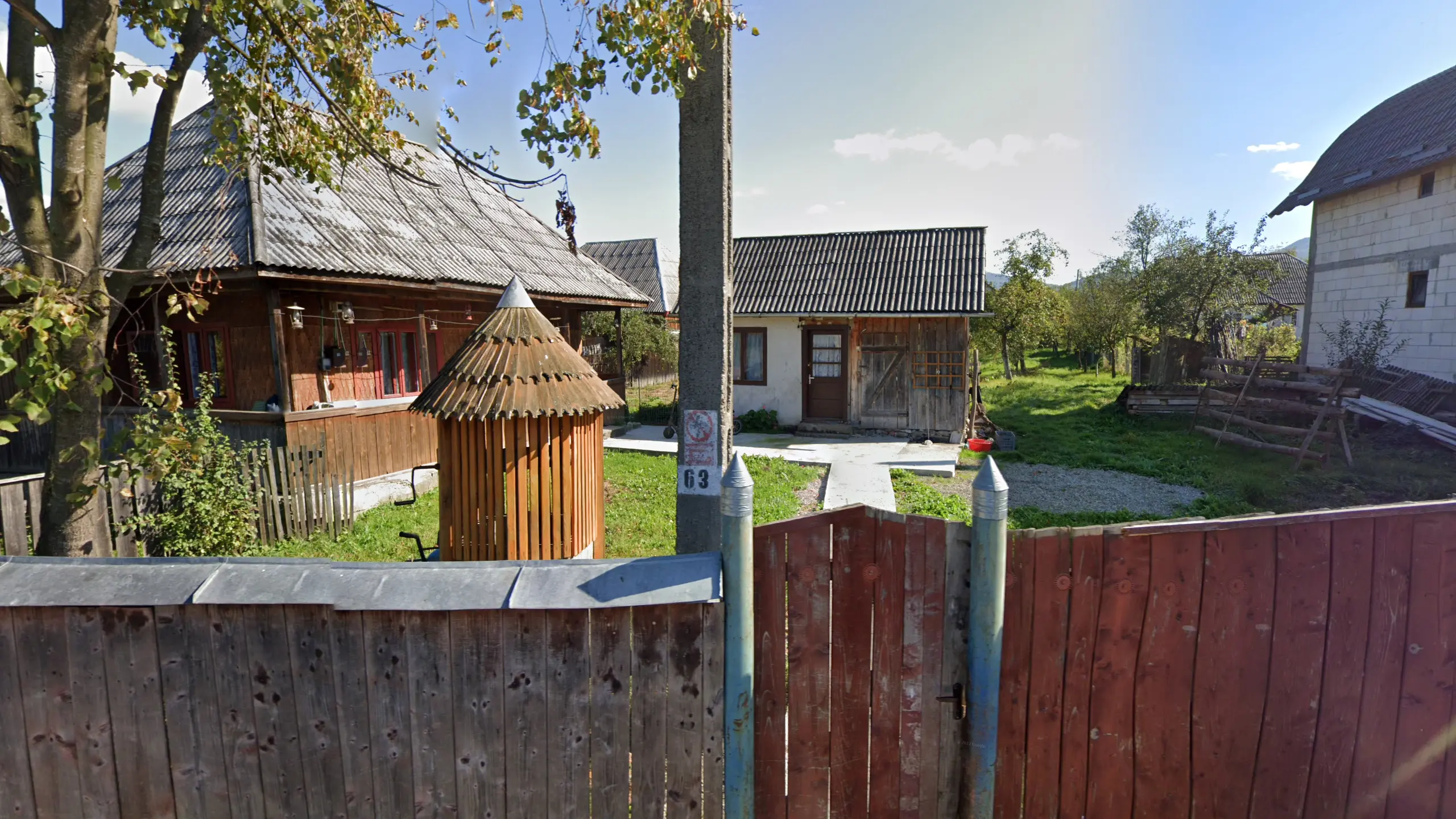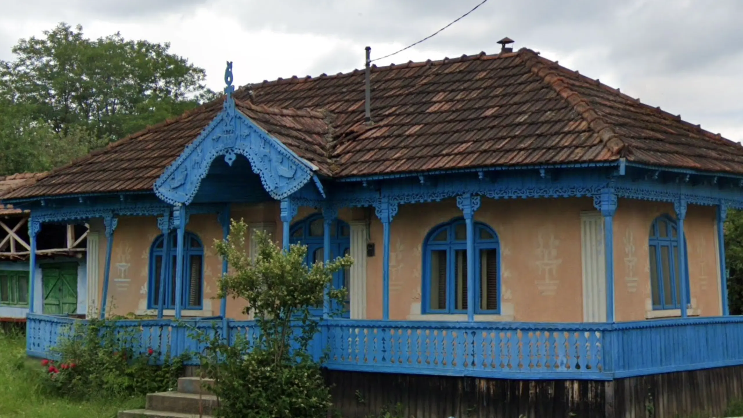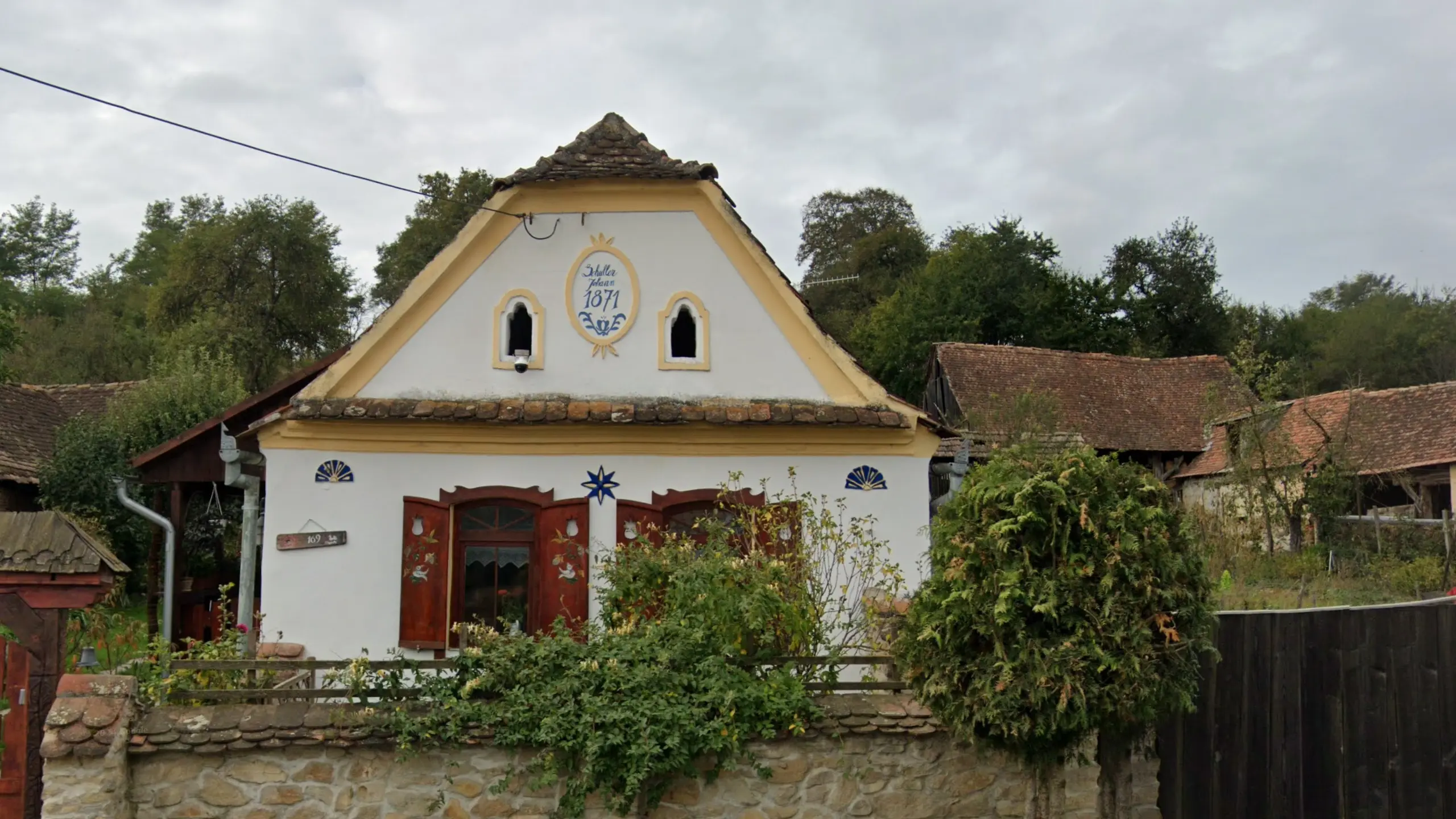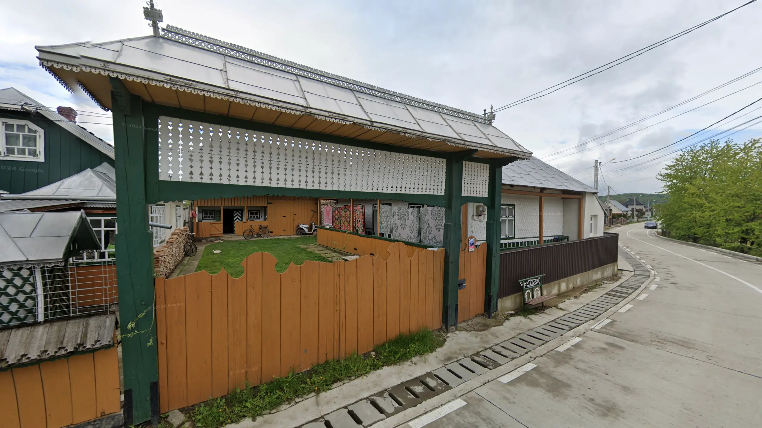 Suceava County has a lot of traditional houses with many unique features. One of these is vertical stripes that decorate either the gables or walls of houses. The ‘sun’ pattern on the gable in the image is also a Suceava meta.