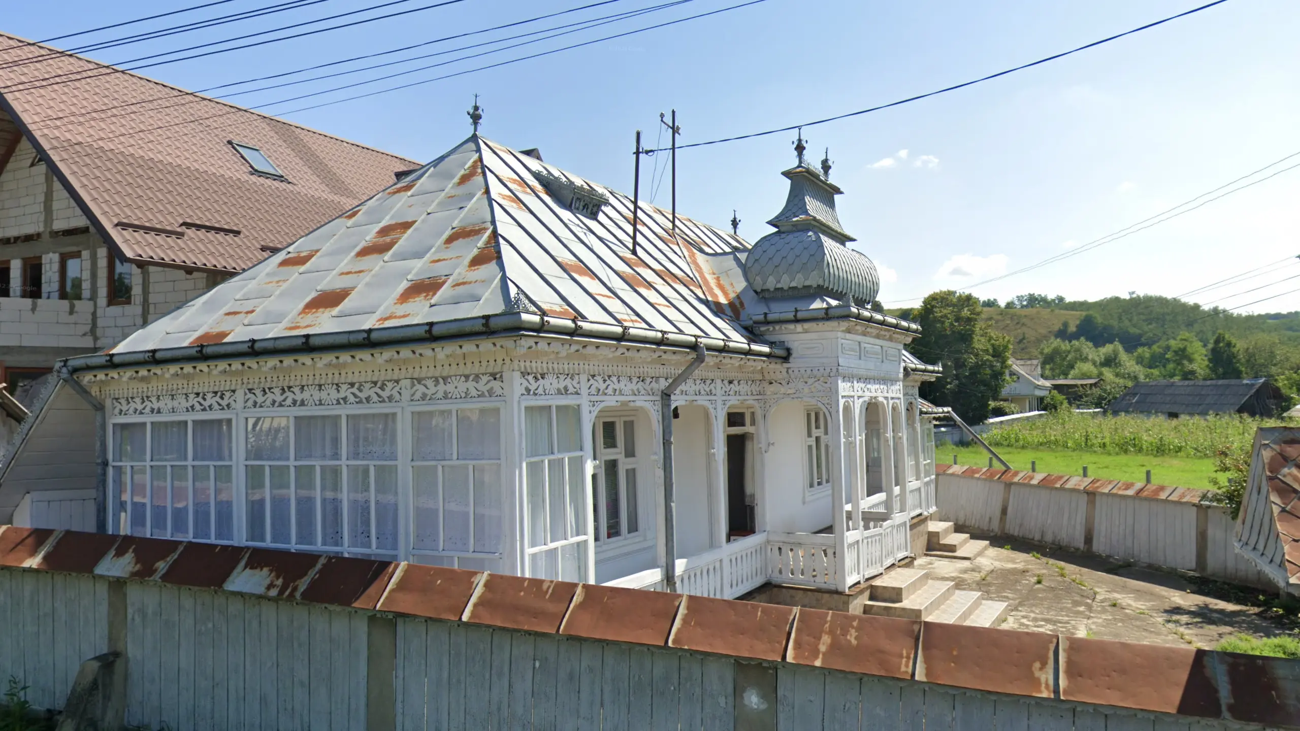 In MureÈ™ county you can sometimes find houses where one of the front corners is rounded, often with some kind of crown or small tower above it.