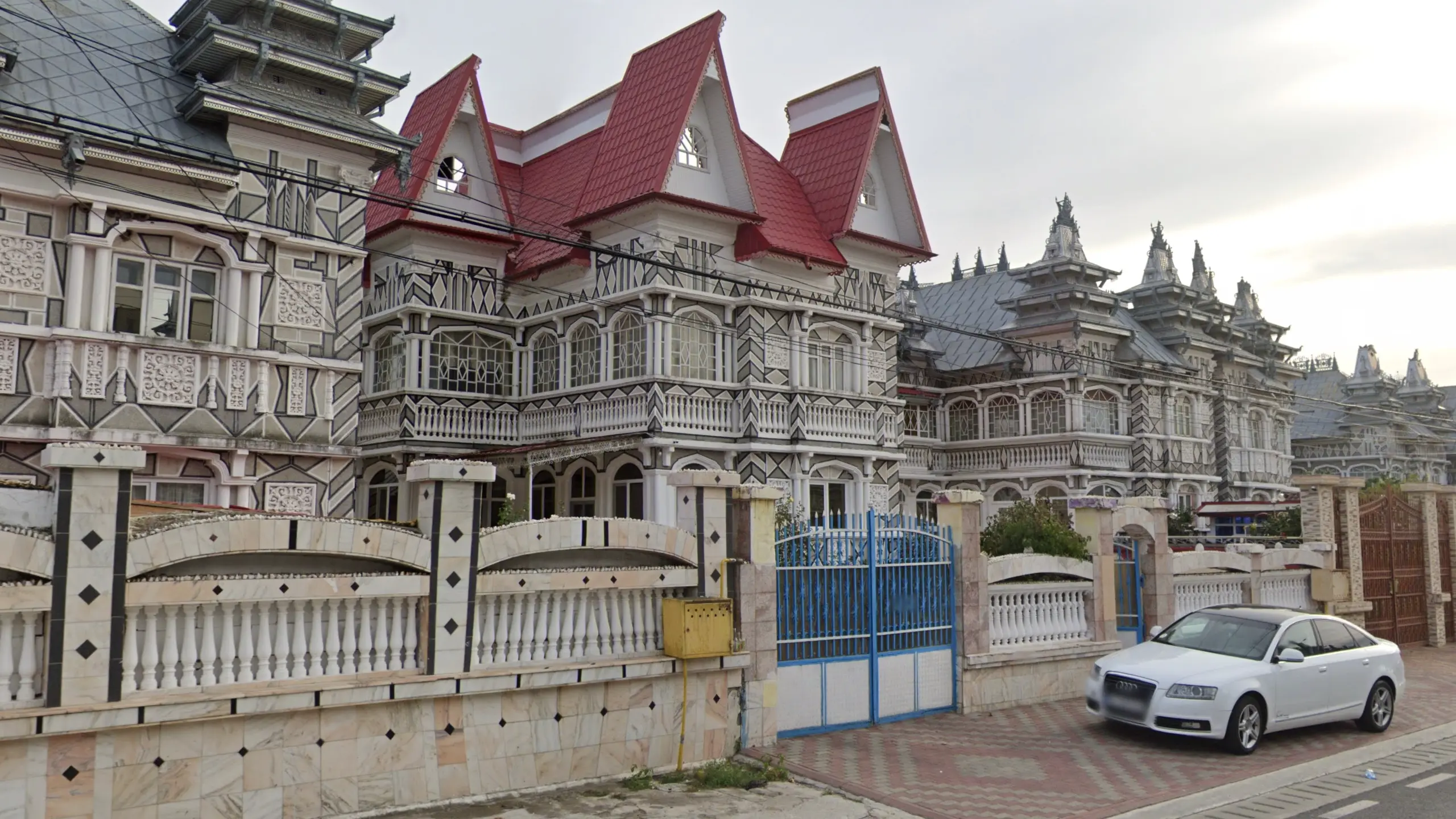 Wealthier Romani neighbourhoods are extremely noticeable for the over-the-top architecture, commonly featuring stacked hat roofs, sharp modern patterning, silver/gold gates and statues, and supersized versions of traditional houses even in small villages.