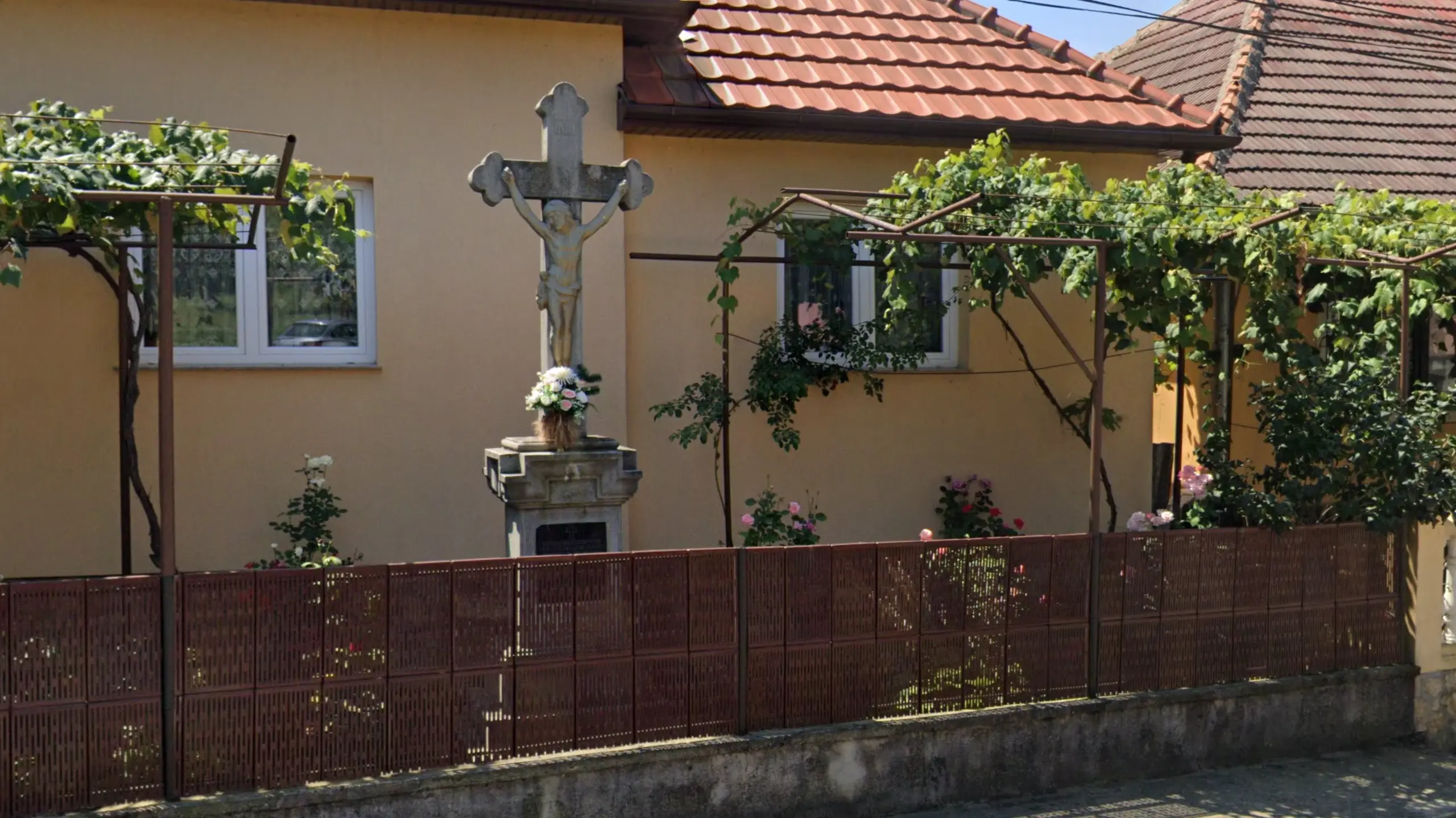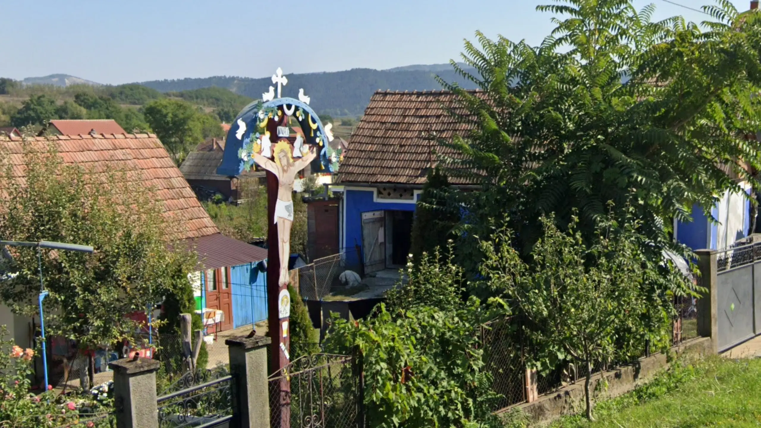 In Cluj county you will very often find this specific style of cross planted in people’s front gardens or by the roadside. It is distinctive for its decorated semi-circular arch above the statuette.