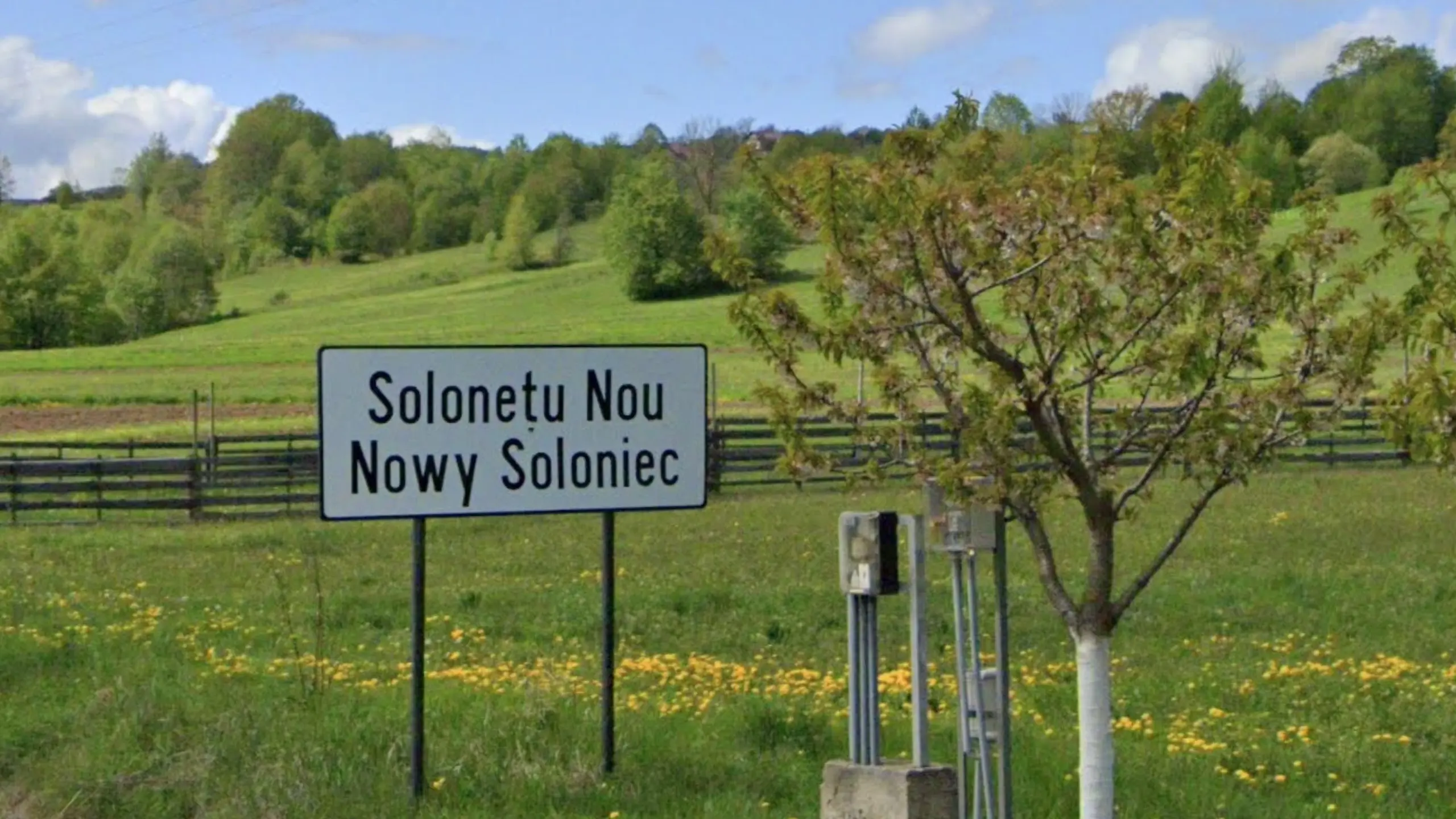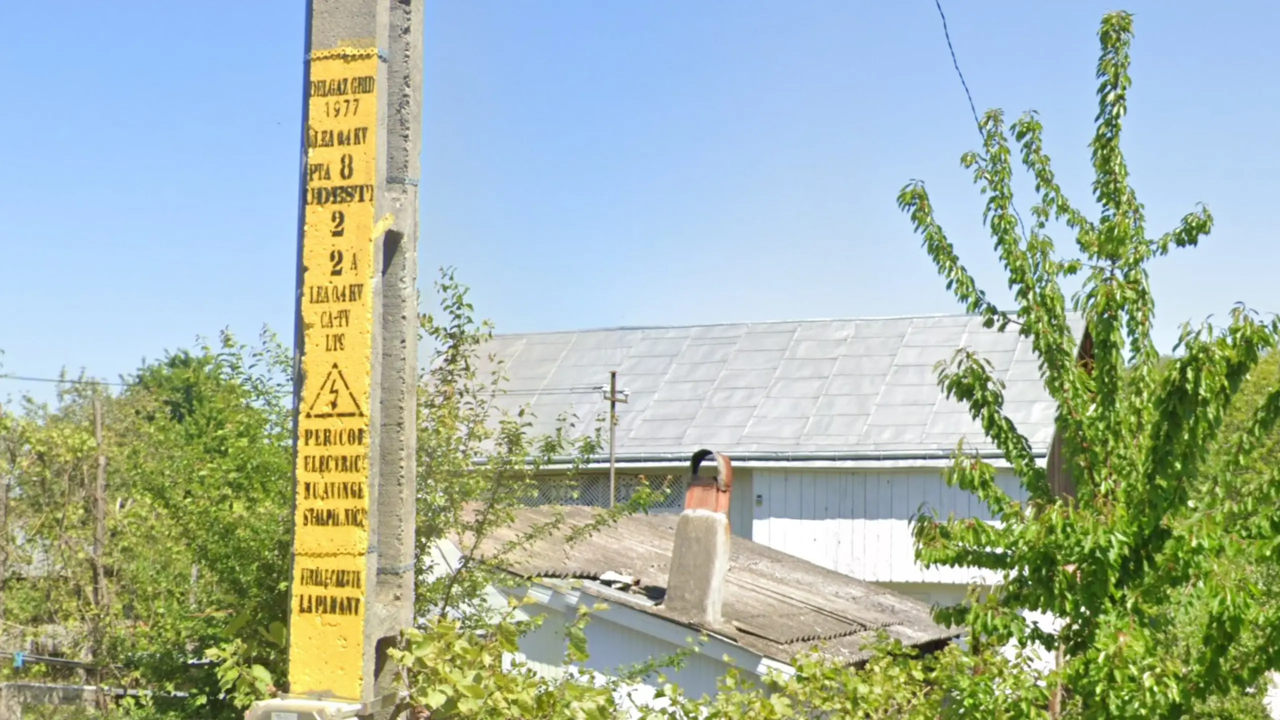 Delgaz covers the northeast of Romania. They mark their poles with particularly long yellow paint with a thunderbolt logo and lots of info in black text, including the town name (in this case ‘Udești’).