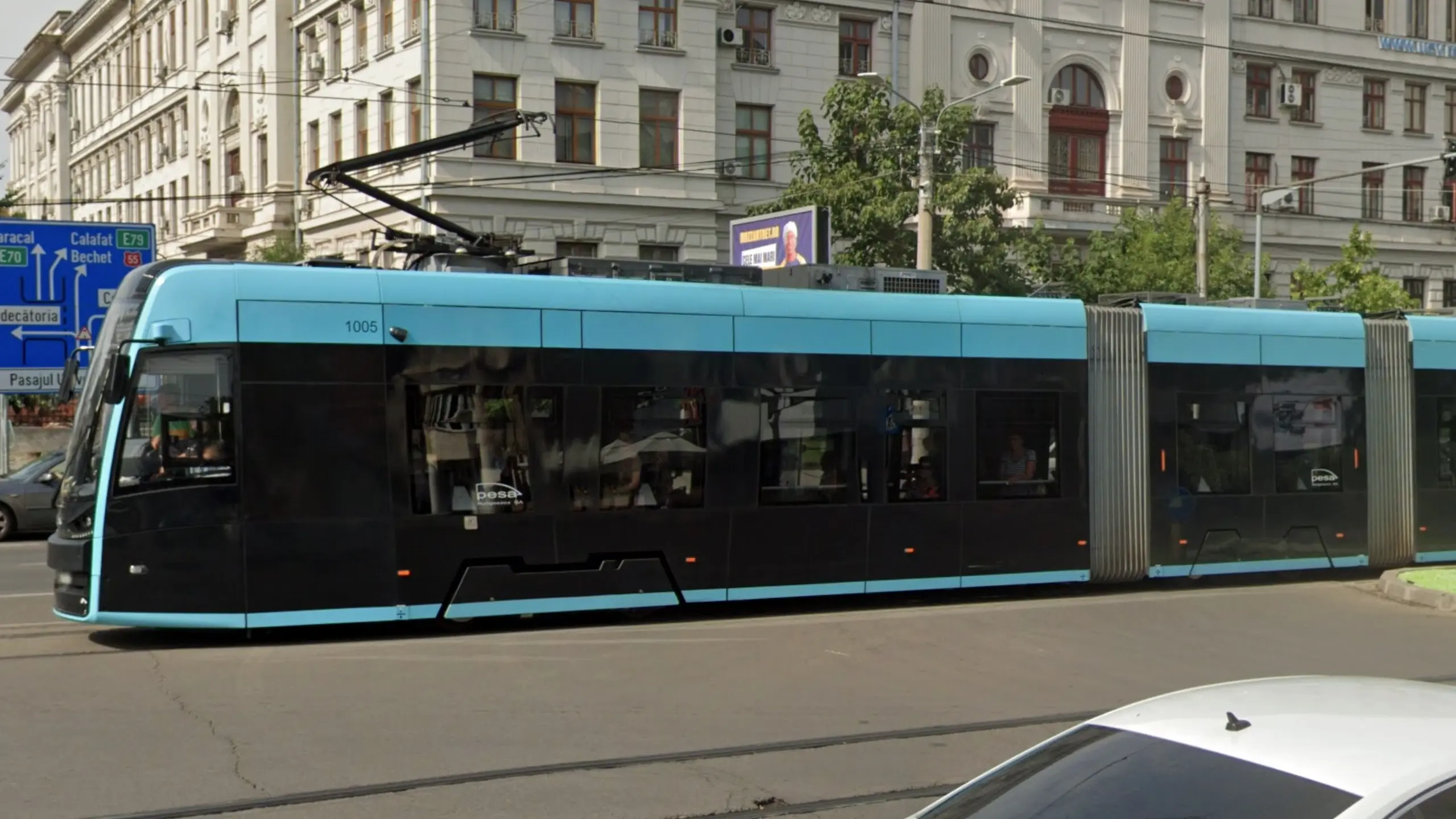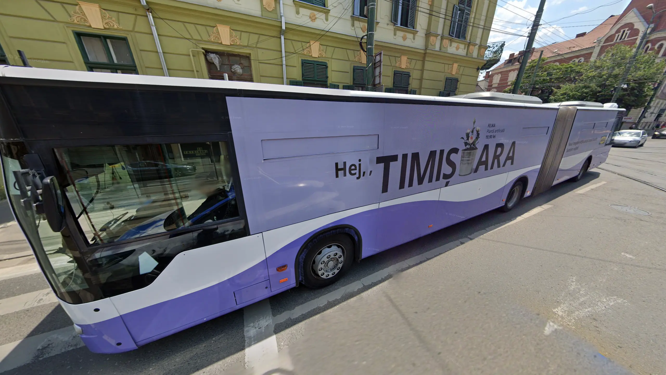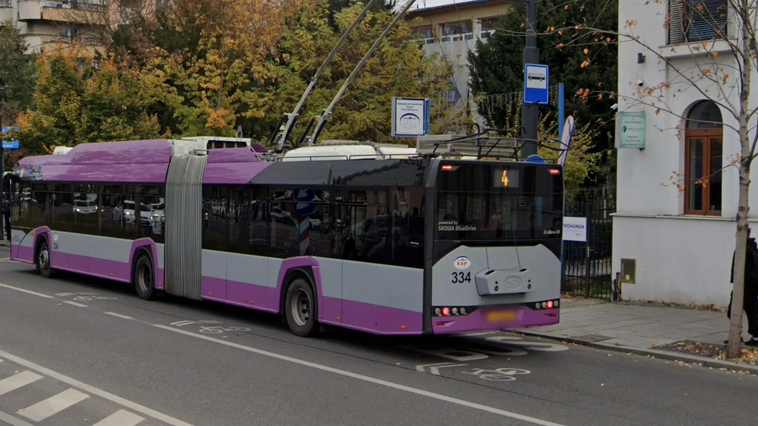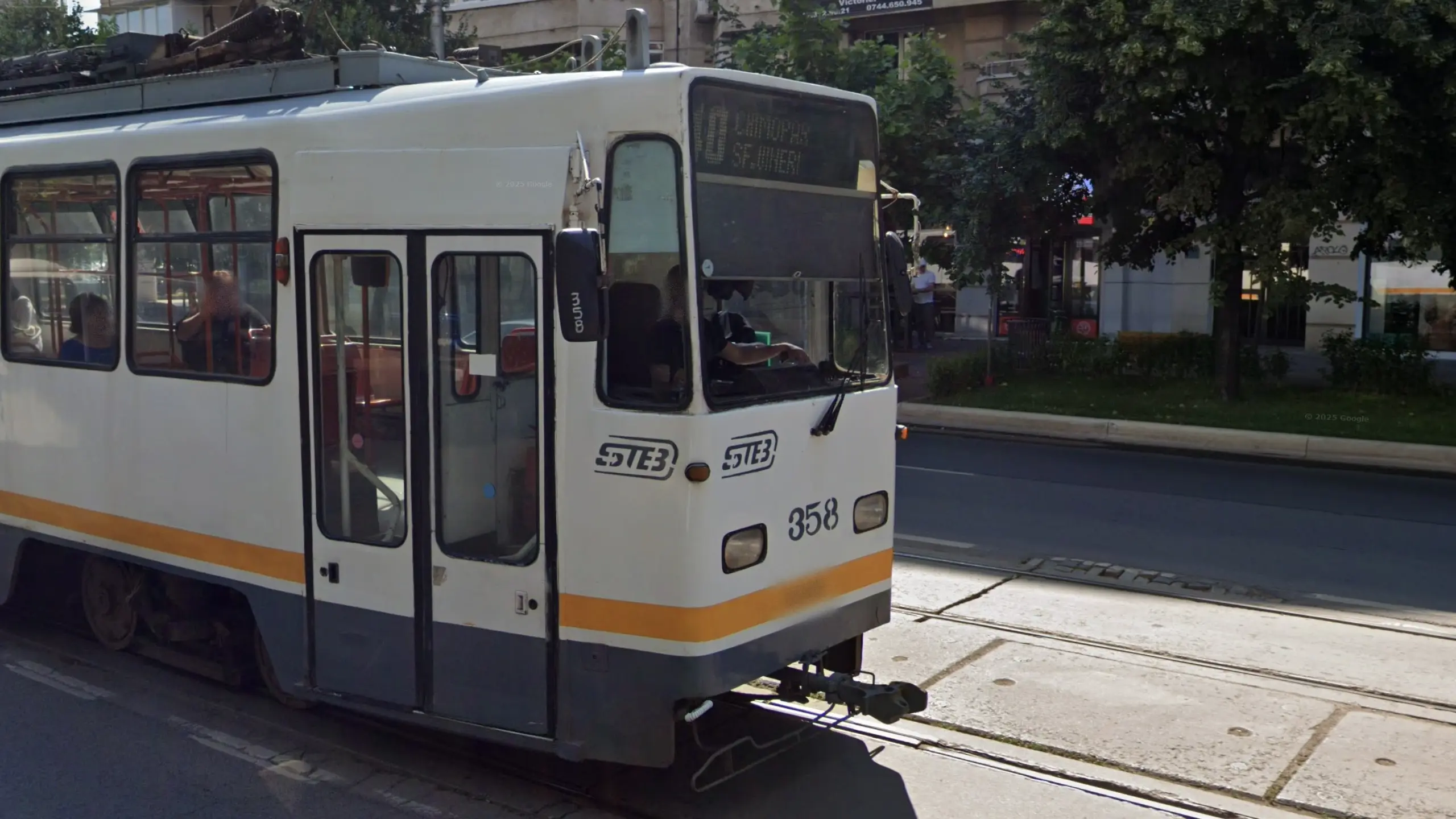 Bucharest busses and trams can have a variety of colours and designs, but all will have the STB (Societatea de Transport București) logo on them.
