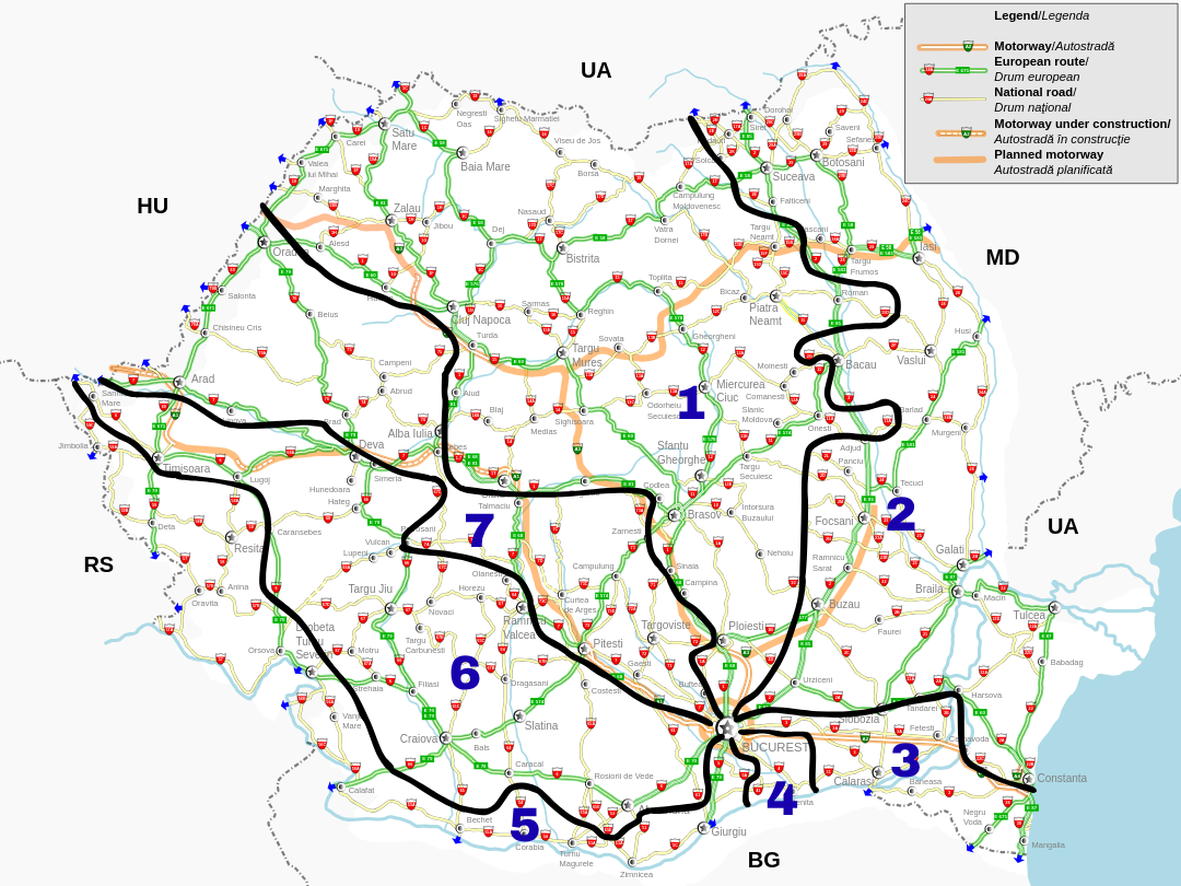 Blue roads in Romania followed a logical, circular pattern with Bucharest at its center. 1XX covers much of Transylvania with the numbers continuing up to 7XX in a clockwise direction.
