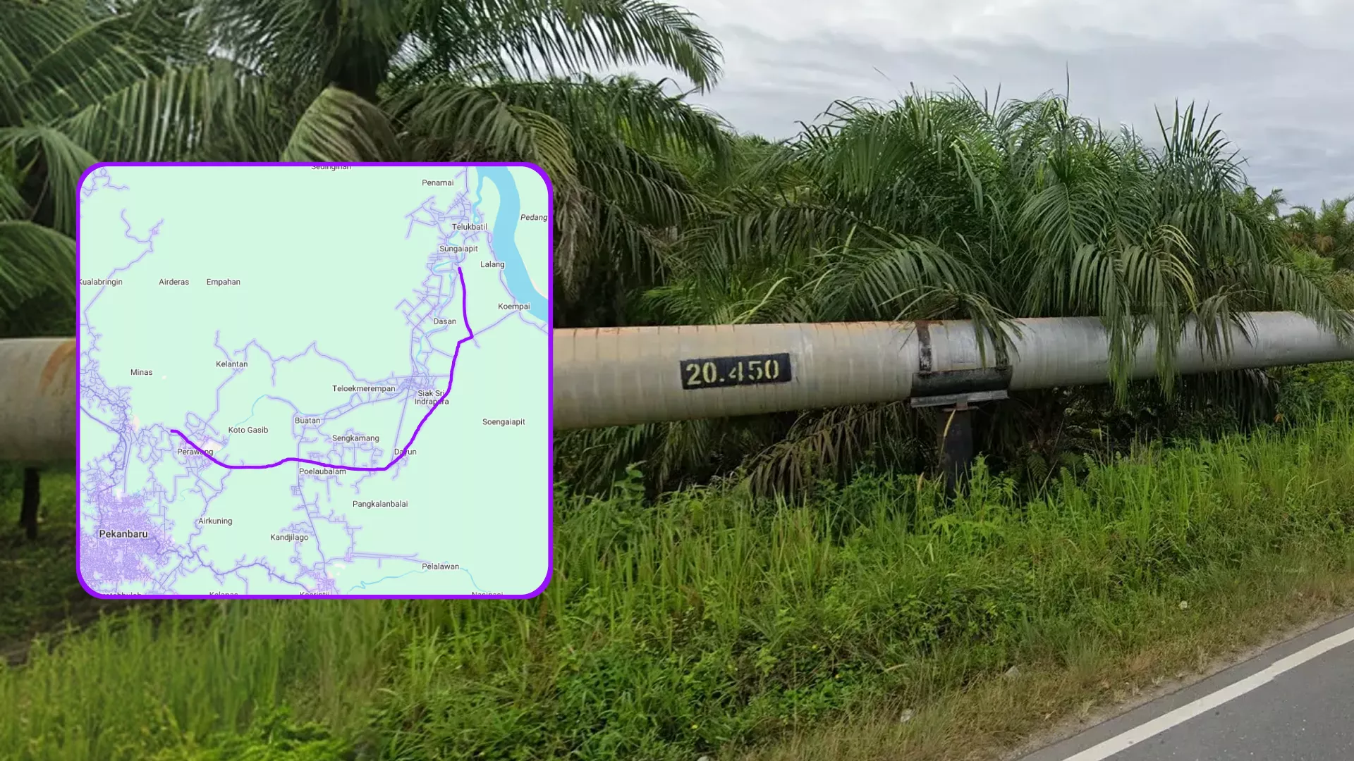 Pipelines in Riau can also help narrow down the location. For example, this pipe with ring-like sections and yellow numbers in the format 'XX.XXX' on a black background can be seen on the stretch of road shown on the map.